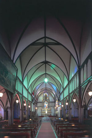 内部平面は他に例を見ない五廊式で第二側廊を持っているが、第二側廊部は柱間毎に仕切られて小祭壇等が設置されているので、会堂部としては三廊式と呼べるものである。