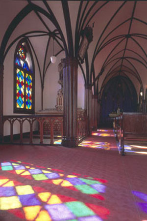 玄関は主廊部に一間入り込んでおり、第二間までの上部が楽廊となっている。主廊幅(N)は20.OO尺、第一側廊幅(I)は12.30尺、第二側廊幅は7.15尺、そして列柱間隔は10.00尺(★3)で、N/I=1.65となる。天井は全て漆喰仕上げ8分割リブ・ヴォールト天井で、アーチは全て尖頭型、支持する列柱は台座・柱頭を持ち半円形の付柱を有する円柱である。