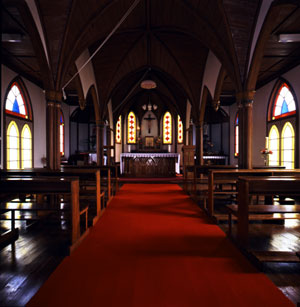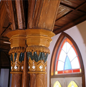 会堂天井は主w)廊部が板張り8分割リブ・ヴォールト天井でアーチは全て尖頭形、側廊部は板張り格天井で、格天井はそれぞれ格間の板張り方向を変えることで変化を持たせている。特徴的なのは列柱間を二連の尖頭アーチを用いたアーケードとしていることで、